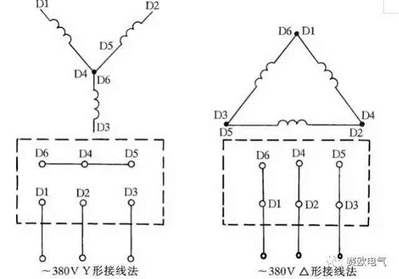 一般常用三相交流電動機接線架上都引出6個接線柱,當電動機銘牌上標為Y形接法時,D6、D4、D5相連接,D1~D3接電源;為△形接法時,D6與D1連接,D4與D2連接,D5與D3連接,然后D1~D3接電源。可參見圖1所示連接方法連接。