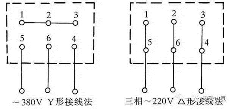 有部分三相吹風機有6個接線端子,接線方法如圖2所示。采用△形接法應接入220V三相交流電源,采用Y形接法應接入380V三相交流電源。一般3英寸、3.5英寸、4英寸、4.5英寸的型號按此法接。其他吹風機應按其銘牌上所標的接法連接。