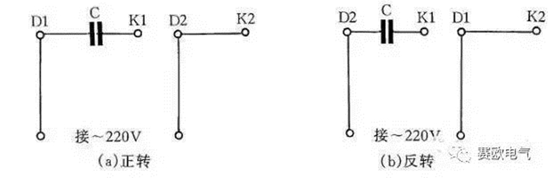 圖4是JX07A-4型單相電容運轉電動機接線方法。電動機功率為60W,用220V/50Hz交流電源、電流為0.5A。它的轉速為每分鐘1400轉。電容選用耐壓400~500V、容量8μF的產品。圖4(a)為正轉接線,圖4(b)為反轉接線。