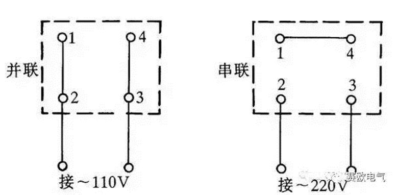 有的單相吹風機引出4個接線端子,接線方法如圖5所示。采用并聯接法應接入110V交流電源,采用串聯接法應接入220V交流電源。