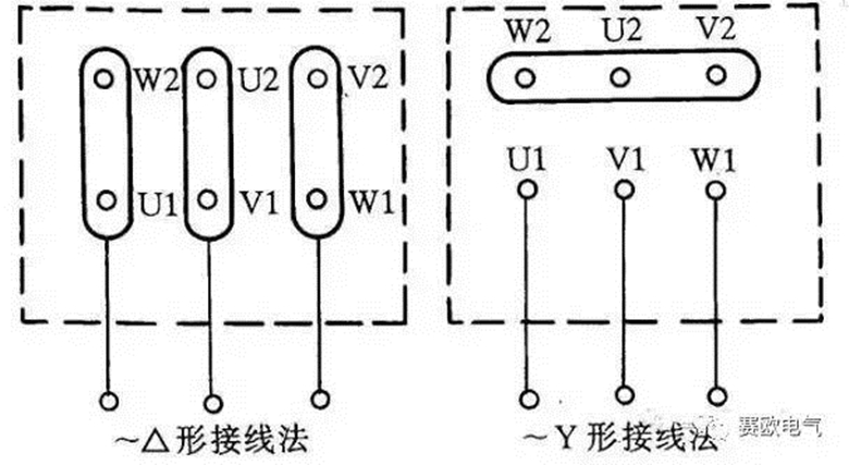 目前,Y系列電動機被廣泛應用。Y系列電動機具有體積小、外形美觀、節電等優點。它的接線方式有兩種:一種為△形,它的接線端子W2與U1相連,U2與V1相連,V2與W1相連,然后接電源;另一種為Y形,接線端子W2、U2、V2相連接,其余3個接線端子U1、V1、W1接電源。接線見圖6。