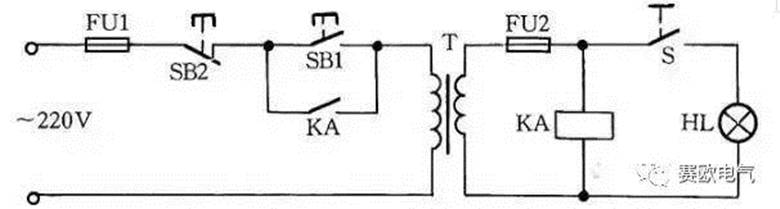 工作原理:閉合S后,按下按鈕SB1,變壓器得電輸出36V低電壓,使得繼電器或交流接觸器KA吸合。放松按鈕SB1后,KA自鎖觸點使KA保持吸合,繼續給變壓器接通電源。如果變壓器次級發生短路故障,繼電器線圈電壓為零,此時KA便失電釋放,將變壓器電源斷開,保護變壓器不被破壞。