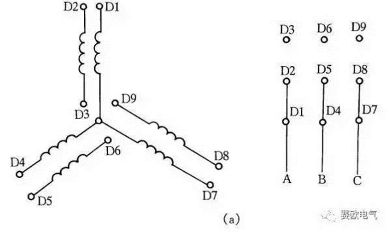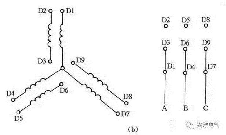 圖8所示是2Y/2Y電動機雙速定子線組的引出線接線方法。按圖8(a)連接是一種轉速,按圖8(b)連接得到另一種轉速。