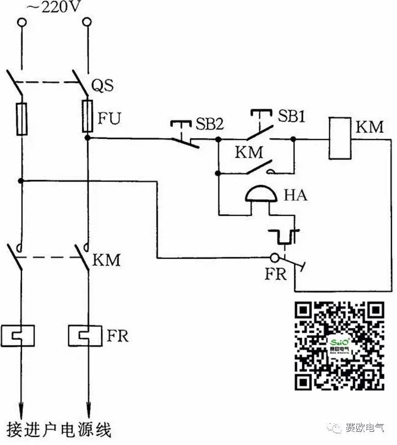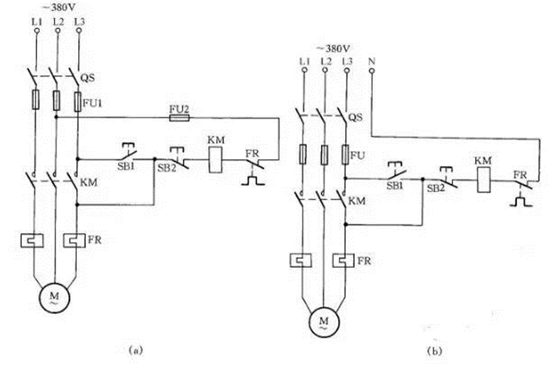 圖中SB2為停止按鈕,在停止時,按動SB2的時間要長一點。否則,手松開按鈕后,接觸器又吸合,使電動機繼續運行。這是因為電源電壓雖被切斷,但由于慣性的作用,電動機轉子仍然轉動,其定子繞組會產生感應電動勢,一旦停止按鈕很快復位,感應電動勢直接加在接觸器線圈上,使其再次吸合,電動機繼續運轉。接觸器線圈電壓為380V時,可按圖12(a)所示接線;接觸器線圈電壓為220V時,可按圖12(b)接線。圖12(a)的接線還有缺陷,即在電動機停轉時,其引出線及電動機帶電,使維修不大安全。因此,這種線路只能在應急時采用,并在維修電動機時,應斷開控制電動機的總電源開關QS,這一點應特別注意。
