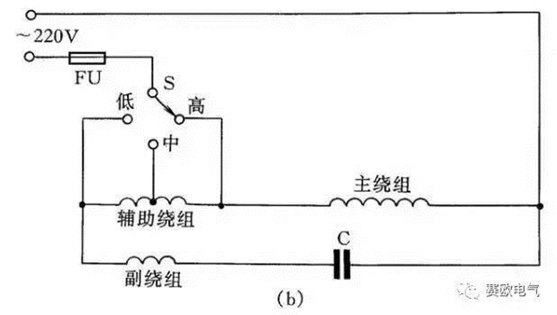 圖11(b)為帶輔助繞組的接線線路,撥動開關S,可改變輔助繞組的抽頭,即改變主繞組的實際承受電壓,從而改變電動機的轉速,此接線方法常用于電風扇上。
