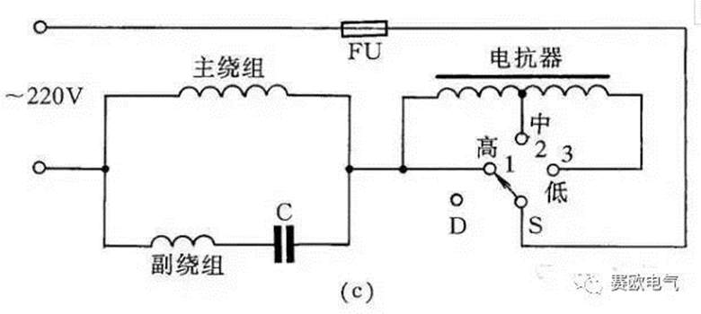 圖11(c)為帶電抗器調速的電容電動機接線線路。由于電抗器繞組(其在線路中起到降壓作用)的串入,調節電抗器繞組的串入量,即可改變轉速。這種方法目前廣泛應用在家用電風扇線路中。在啟動電動機時一般先撥到“1”擋上,即為高擋,這時電抗器不接入線路,使電動機在全壓下啟動,然后再撥“2”擋或任何擋來調節電動機轉速。