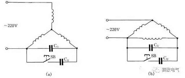 如圖12所示:圖(a)為Y形接法電動機連接方法,圖(b)為△形接法電動機連接方法。為了提高啟動轉矩,將啟動電容CQ在啟動時接入線路中,在啟動完畢后退出。